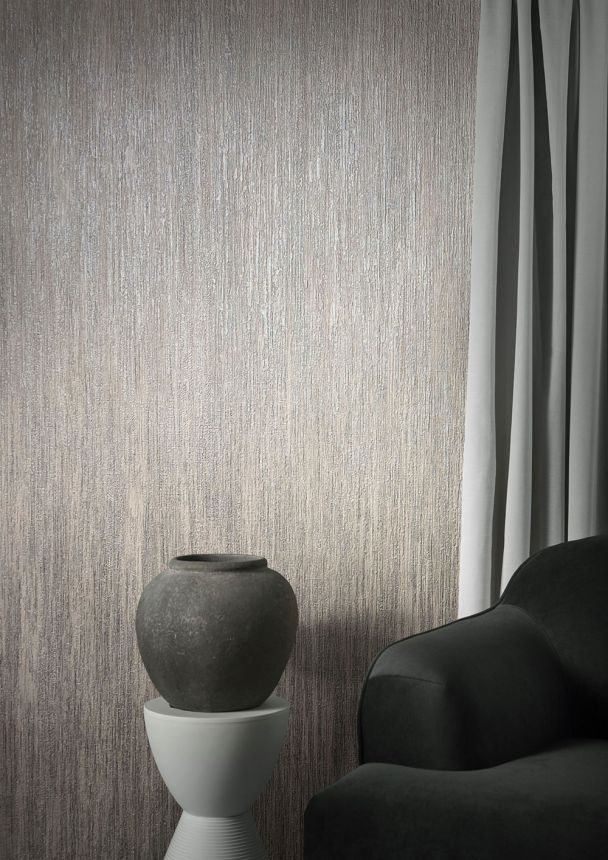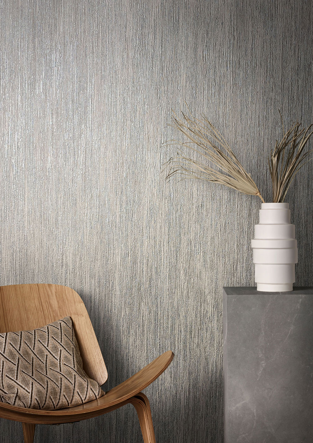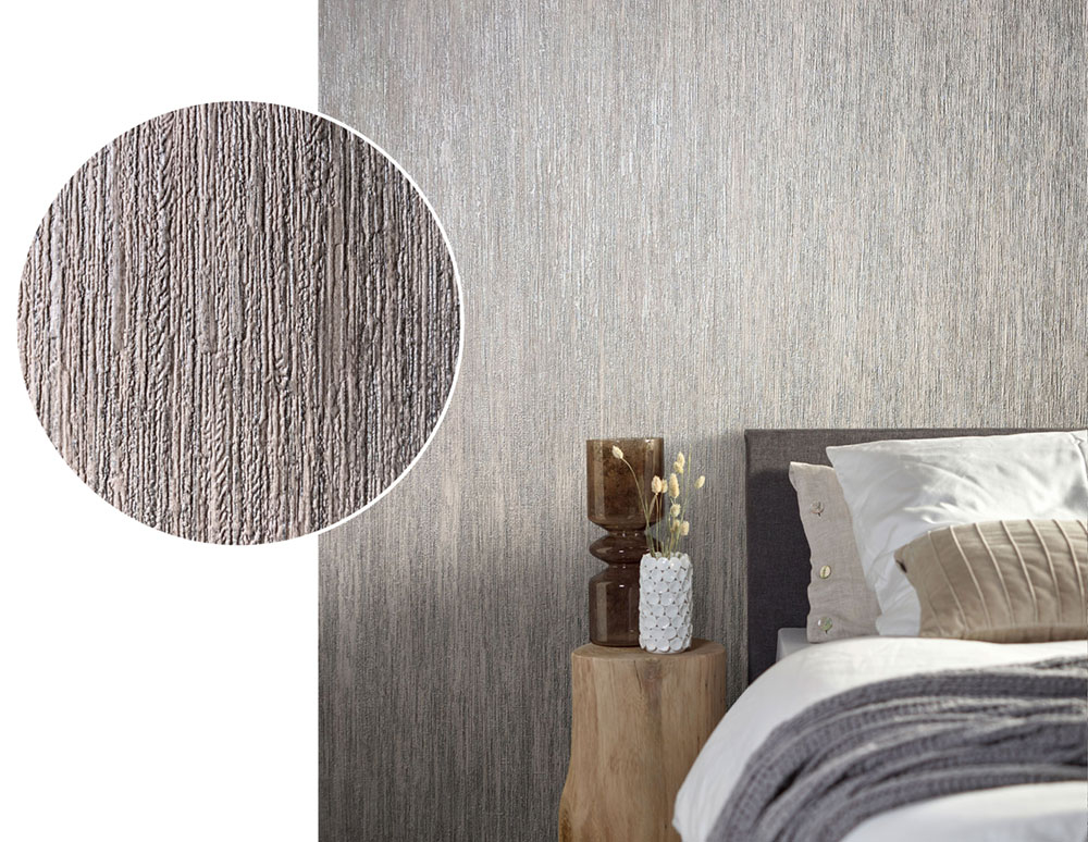 Luxuriöse, strukturierte Tapete, Beigetöne, silberne Akzente.