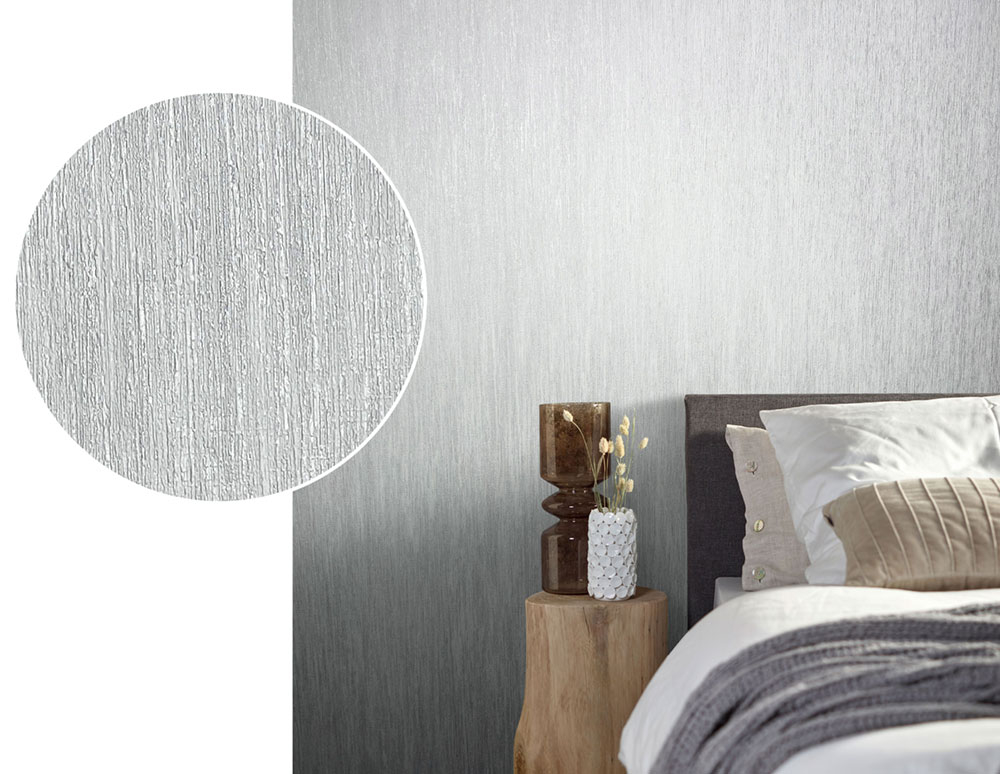 Luxuriöse, strukturierte Tapete, Grautön, silberne Akzente.