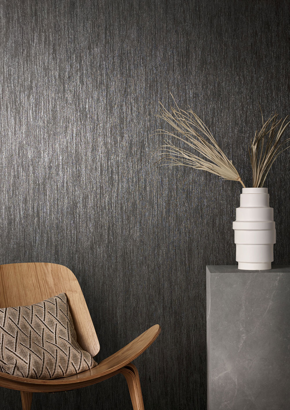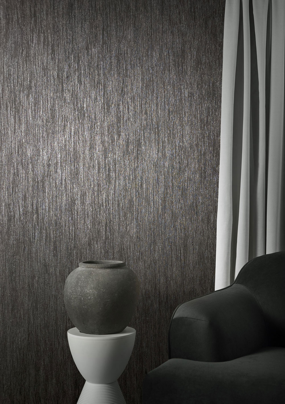 Luxuriöse, strukturierte Wolltapete, schwarz mit silbernen Akzenten.