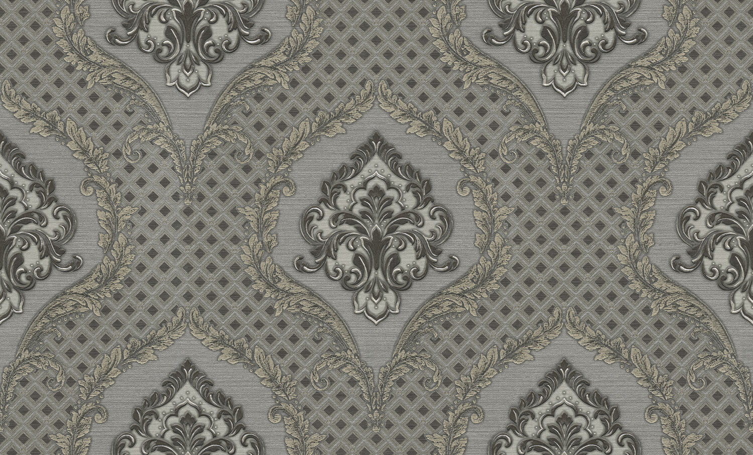 Luxuriöse metallische braun-silberne Barocktapete mit Ornamenten auf geometrischem Hintergrund.