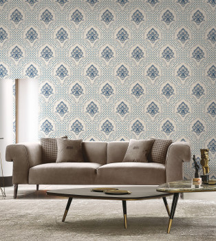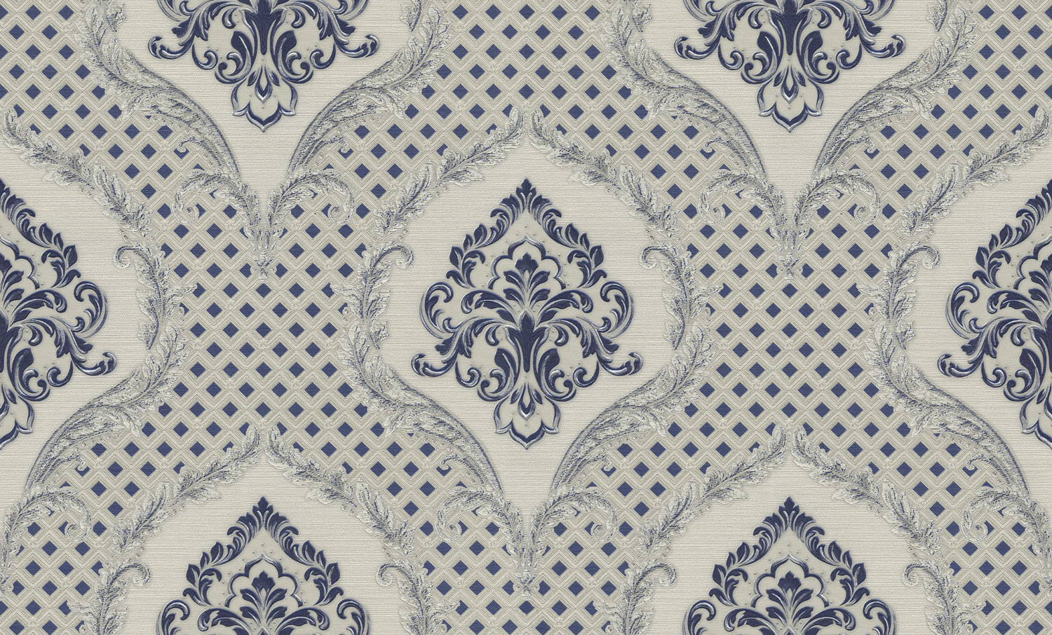 Luxuriöse metallische blau-silberne Barocktapete mit Ornamenten auf geometrischem Hintergrund.