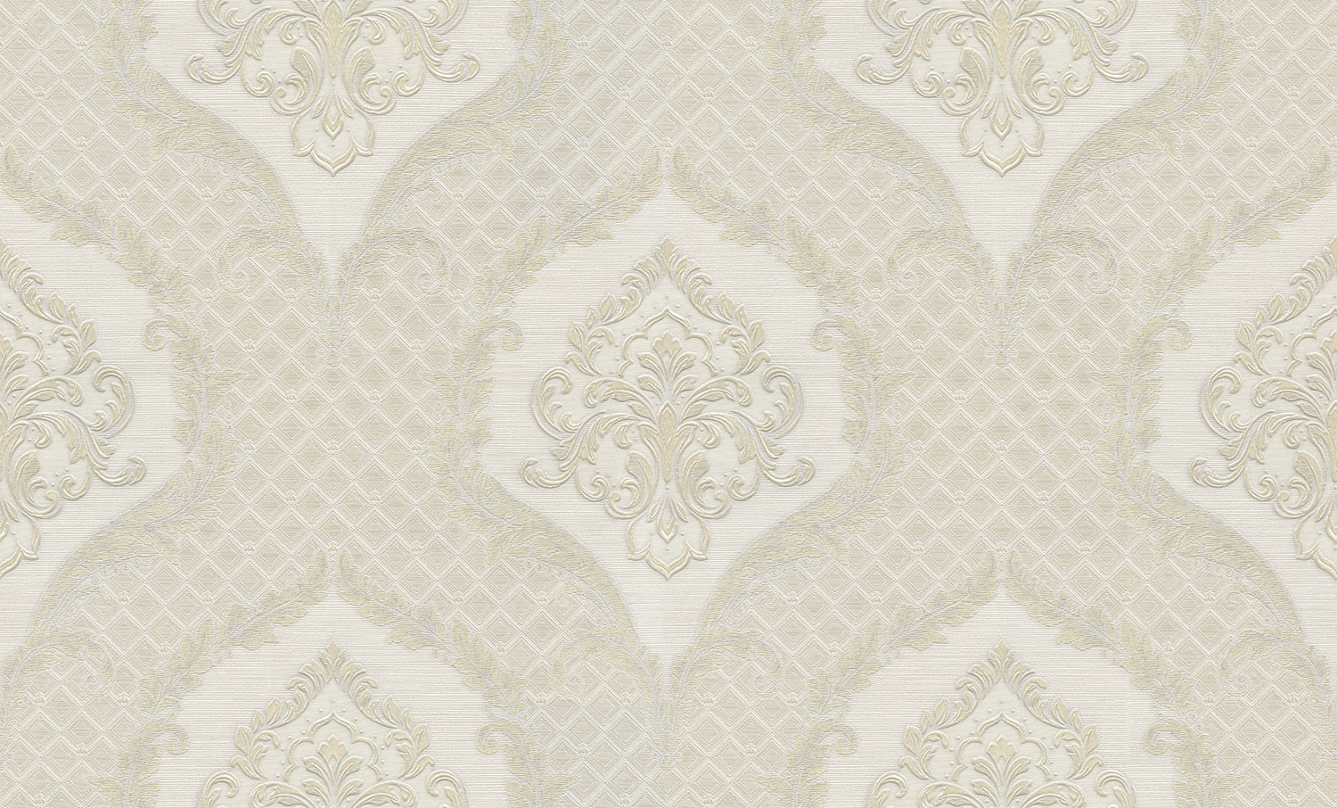 Luxuriöse metallische weiß-goldene Barocktapete mit Ornamenten auf geometrischem Hintergrund.