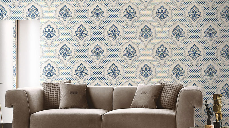 Die Farbpalette der Tapeten umfasst seltene und unverwechselbare Metalltöne wie Gold und Silber, zusammen mit modernen Farben wie Smaragdgrün und dem ikonischen Blau der Marke Ferré.