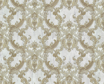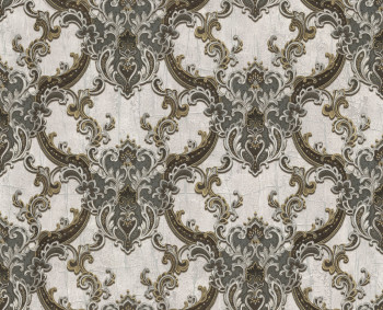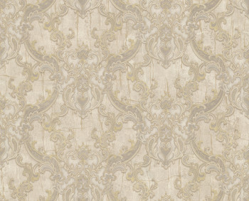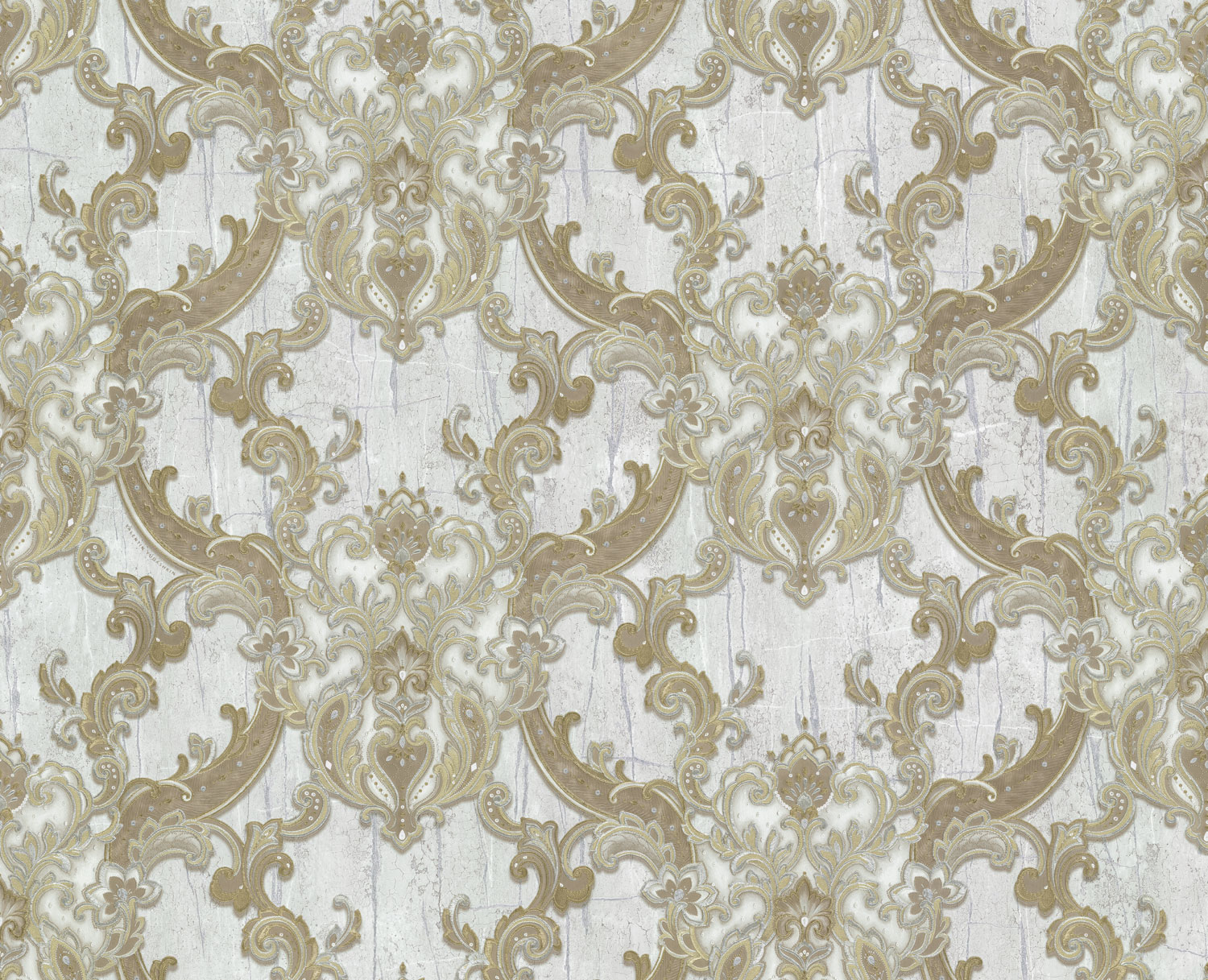 Luxustapete mit goldenen Barockornamenten auf einem Hintergrund, der grau-silbernen Putz imitiert. Das Foto des Innenraums dient nur der Veranschaulichung – verschiedene Farben.