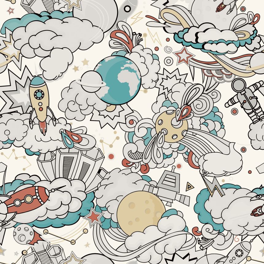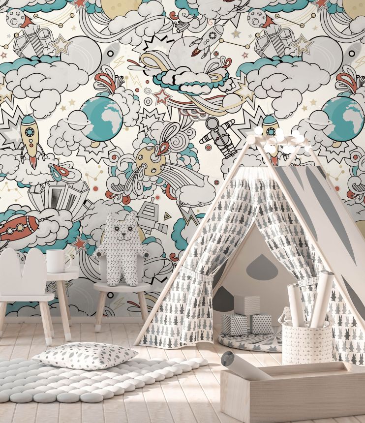 Kinder-Vliestapete mit Vinyloberfläche, Weltraummotiven, Raumschiffen und Kosmonauten.