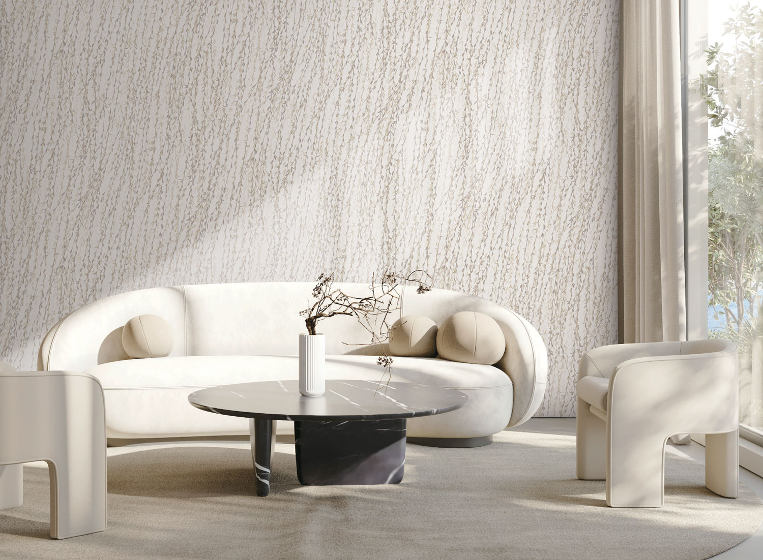 Lassen Sie sich von den wehenden Weidenzweigen oder Tapeten mit natürlichen Mustern aus Bäumen und Vögeln mitreißen, die auf unkonventionelle Weise zu Ornamenten arrangiert sind und zudem den Eindruck erwecken, als wären sie auf die Tapete gestickt.
