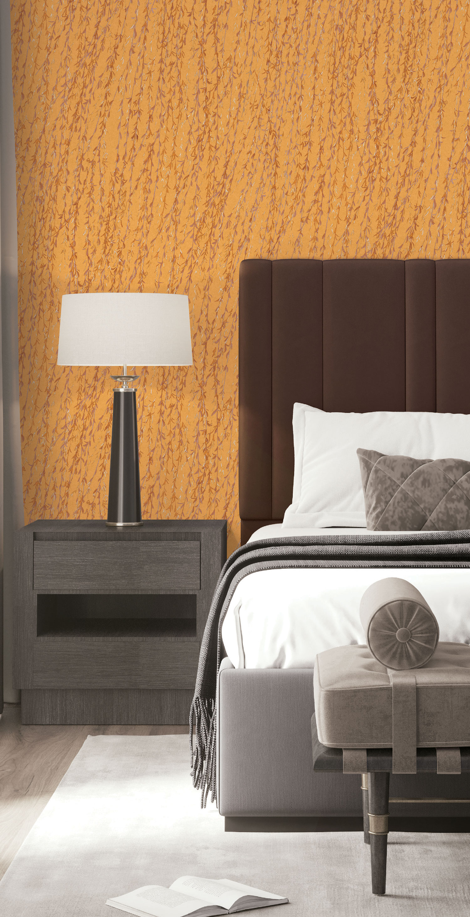 Lassen Sie sich von den wehenden Weidenzweigen oder Tapeten mit natürlichen Mustern aus Bäumen und Vögeln mitreißen, die auf unkonventionelle Weise zu Ornamenten arrangiert sind und zudem den Eindruck erwecken, als wären sie auf die Tapete gestickt.