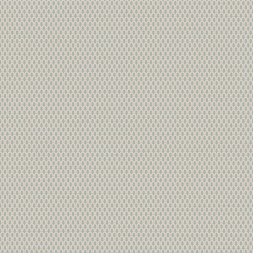 Luxuriöse Vliestapete, fein geprägte Textur aus Seidenstoff mit Bogenmuster, Blaugrün- und Weißtöne, goldene Konturen.