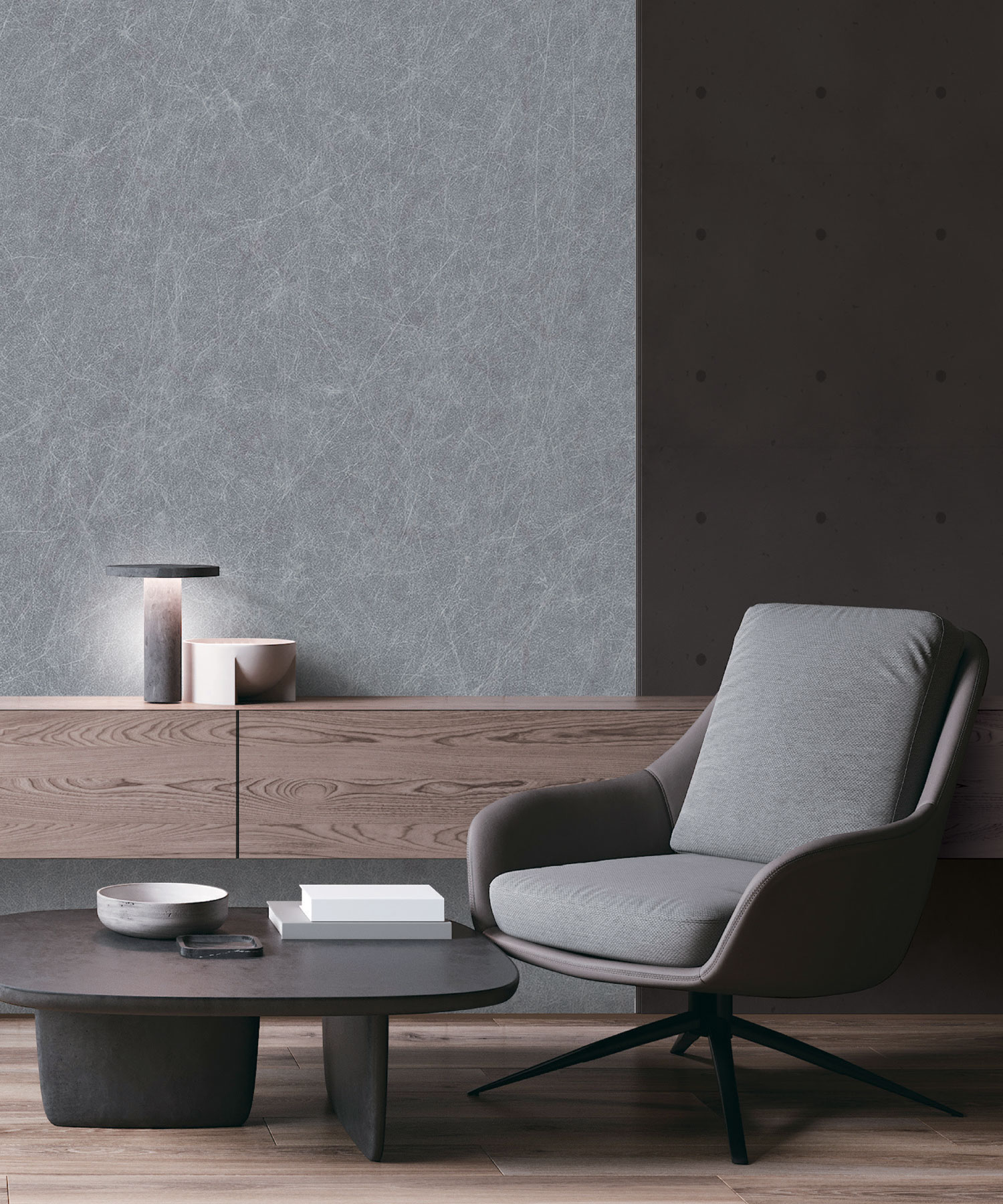 Luxuriöse graue Vliestapete mit fein geprägter Textur, die an ein natürliches Material erinnert.