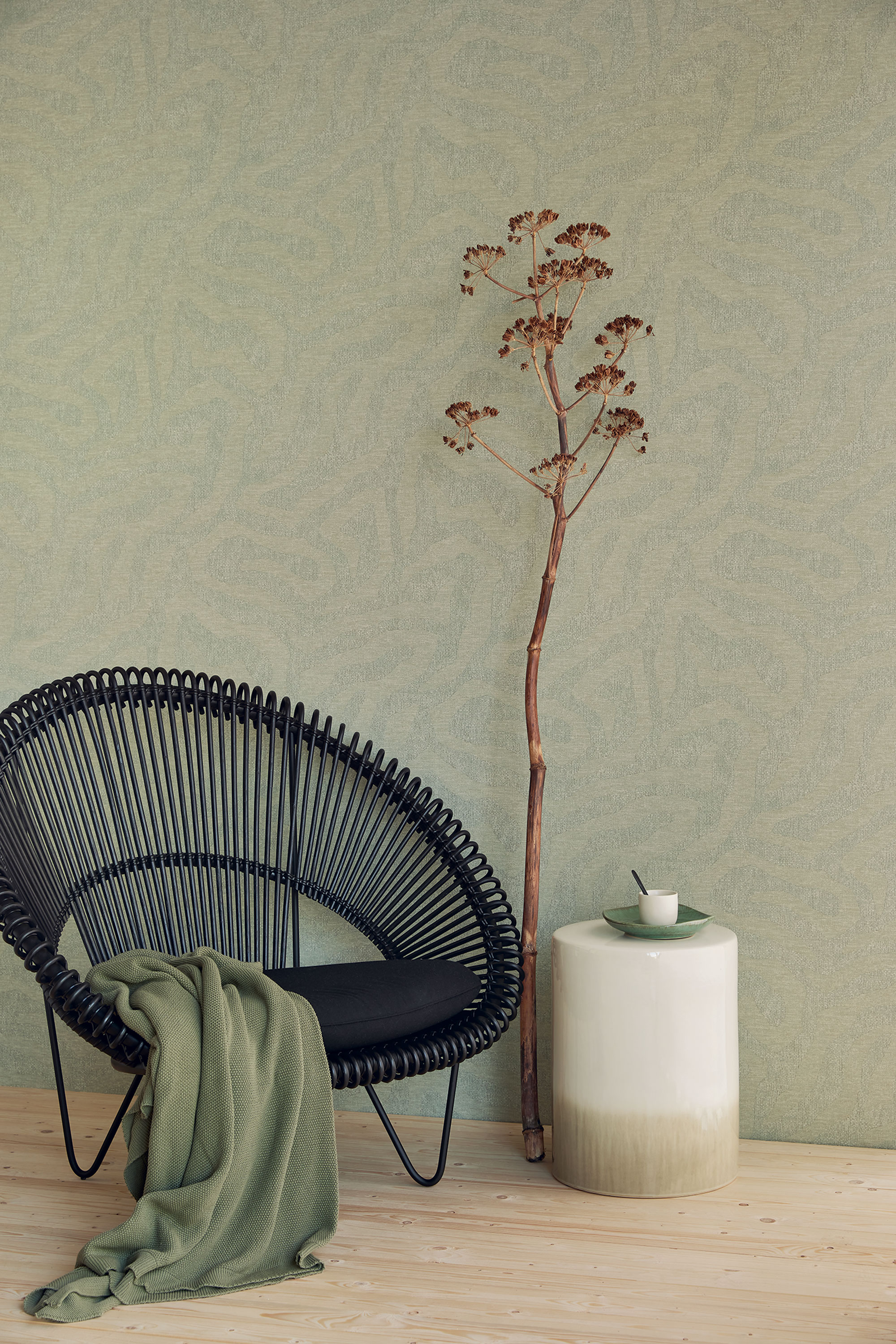 Lassen Sie Ihre Finger den Fäden folgen, die rhythmisch zu einem organischen Motiv verwoben sind. Träume von Sandwellen, die von Meereswellen geformt werden. Lassen Sie sich von farbigen Punkten in fantasievollen Mosaiken oder subtilen Farbschichten mit der Überschwänglichkeit keramischer Glasuren inspirieren. Sie können sich auch für ein dezentes Blattmuster auf der Tapete entscheiden, das sanft auf einem matten Hintergrund schimmert. Oder ein feiner grafischer Einband, der an einen Wandteppich erinnert. Warme Neutraltöne, errötende Erdtöne, nebliges Graugrün und intimes Ocker bereichern Ihr Interieur.