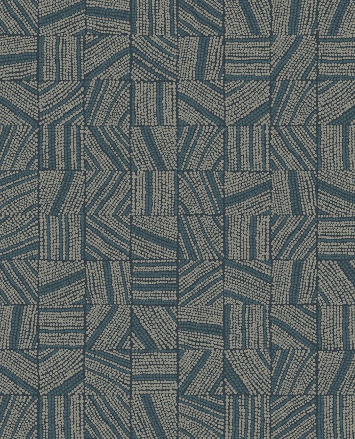 Blaue Vliestapete, feines, geprägtes Mosaikmuster mit Punkten in Blau- und Grautönen.