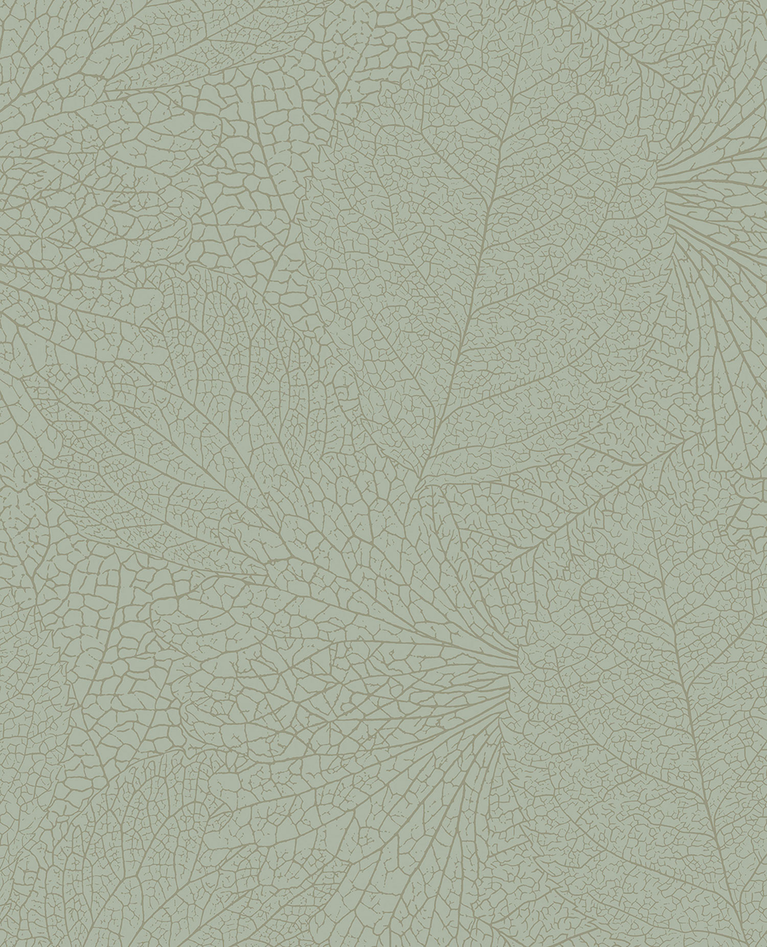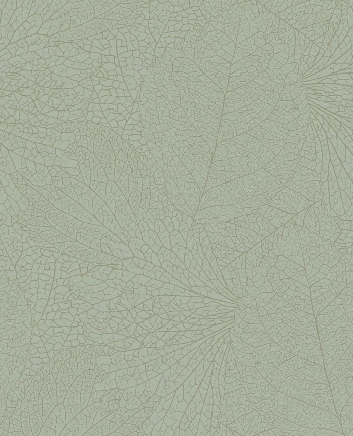 Grüne matte Vliestapete, metallisch-silberne Umrisse von Blättern.