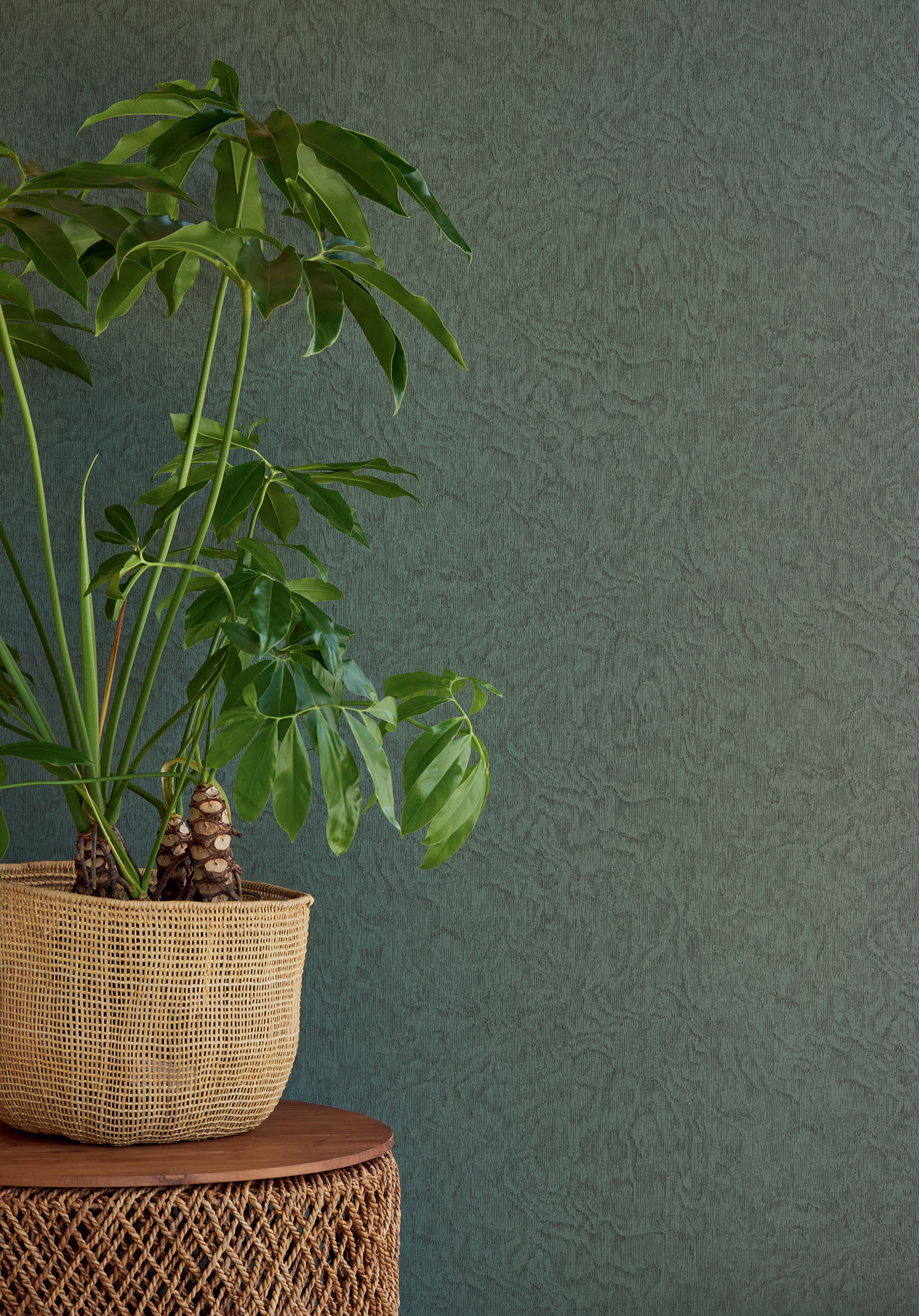 Grüne Vliestapete mit cremefarbener, fein geprägter Textur.