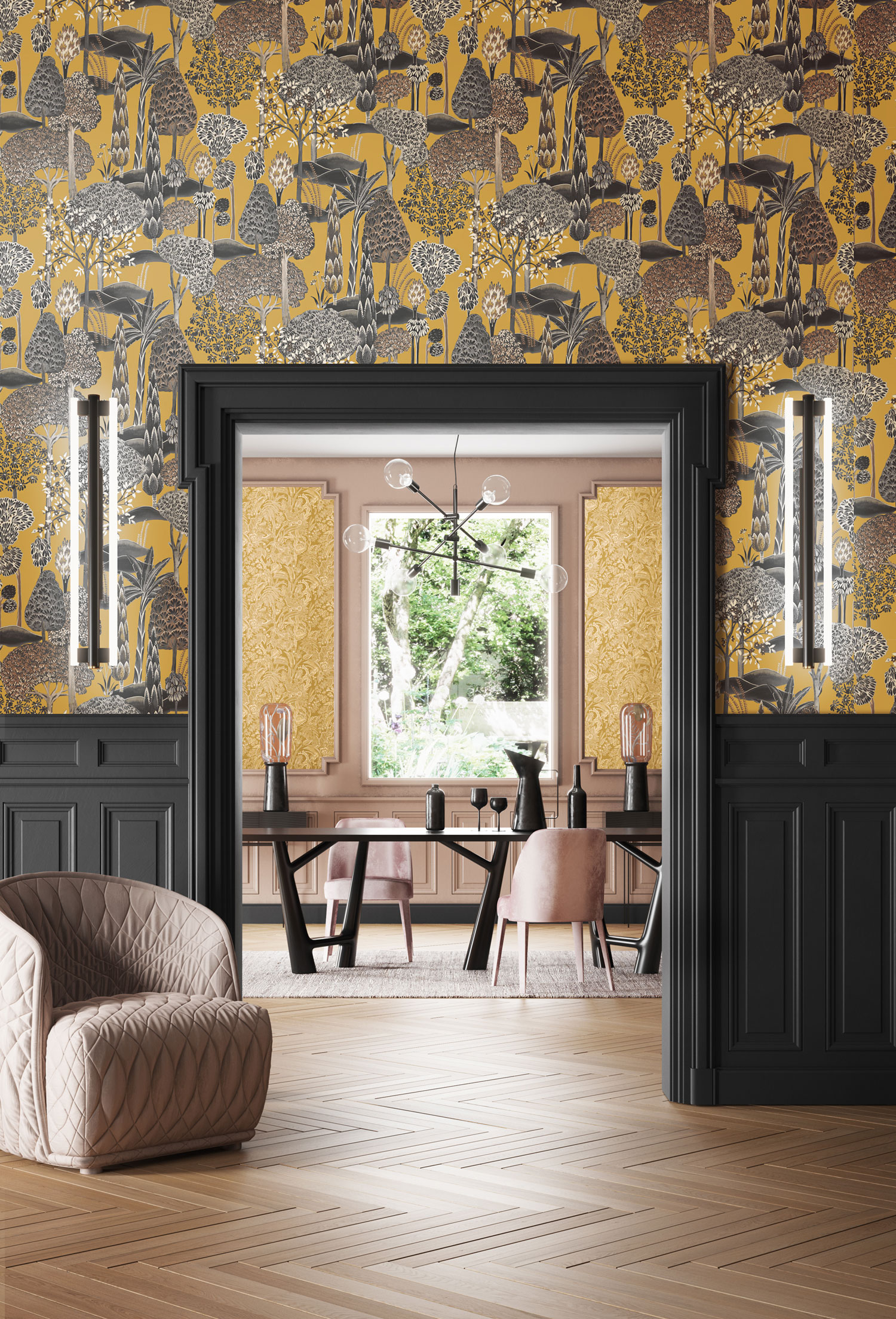 Dunkle ockerfarbene Vliestapete, Baummotive in Grau- und Schwarztönen, stellenweise goldene Details.