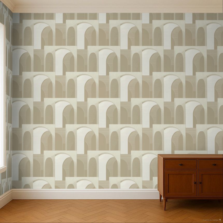 Fein strukturierte cremefarbene Metallic-Vliestapete.