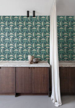 Strukturierte Vliestapete, geometrisches Retromuster in Blau-, Beige- und Metallic-Grüntönen.
