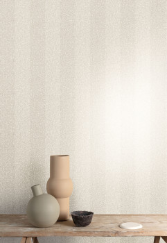 Fein strukturierte Vliestapete, Imitation eines gestreiften Tweed-Stoffes, Weiß- und Cremetöne, Perlmuttreflexe. Streifen ca. 6-7 cm