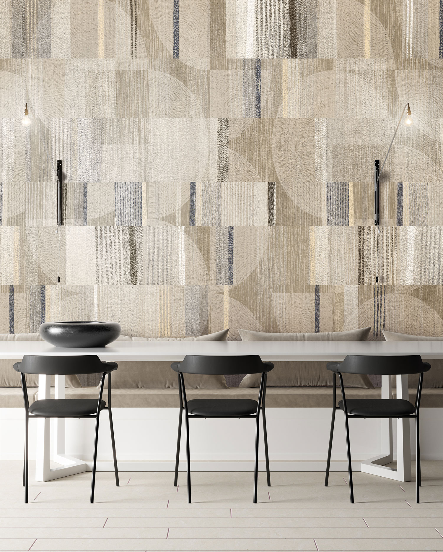 Die Farben und Muster dieser Kollektion spiegeln die Versöhnung des Menschen mit der Natur wider. Der Mensch nutzt seit Jahrtausenden natürliche Materialien. Anstatt Bleistifte und Pinsel zu verwenden, haben wir Muster aus Sisalseilen hergestellt, Formen aus Marmor konstruiert und Muster aus Naturgarnen gestickt.