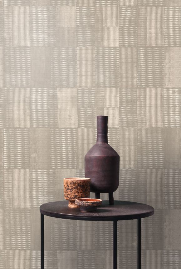 Braune Vliestapete, Imitation eines gröberen Stoffes, Brauntöne, silbrige Reflexe.