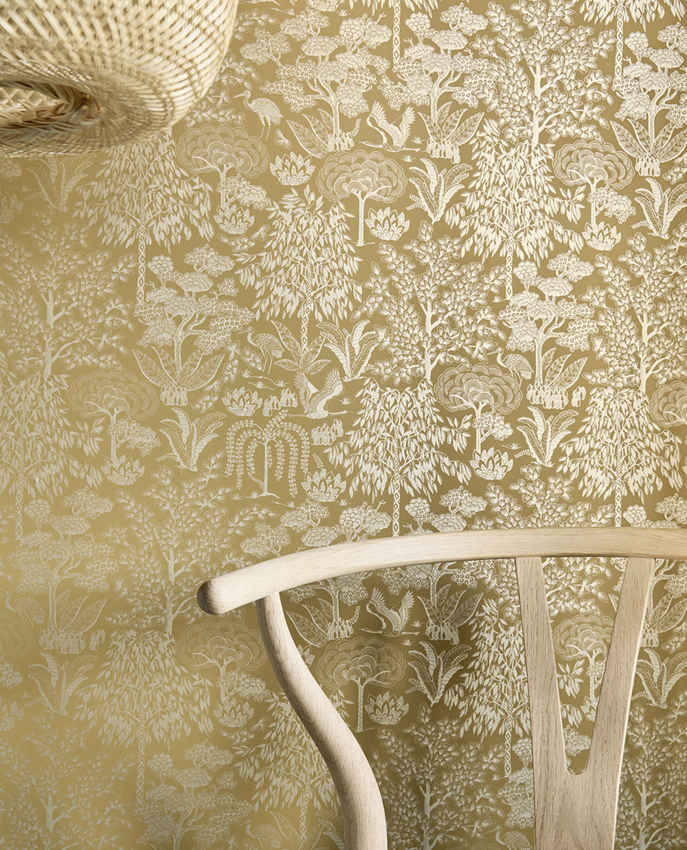 Matte ockerfarbene Vliestapete, goldenes Metallic-Muster mit Bäumen und Vögeln.