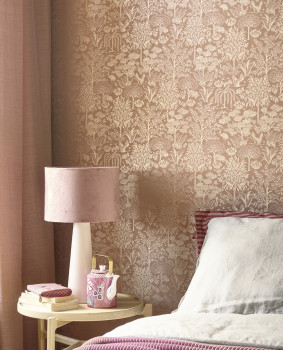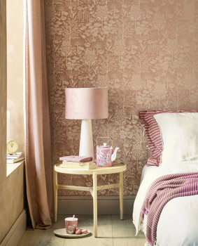 Matte dunkelrosa Vliestapete, metallisches Muster aus Bäumen und Vögeln – Farbe Roségold.