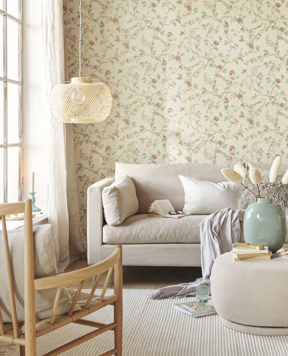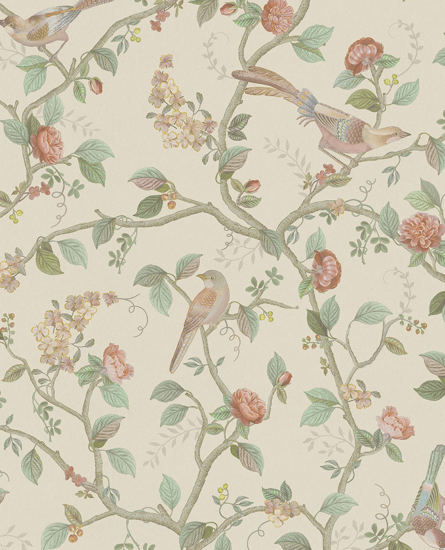 Glatte Vliestapete in Beige, Motiv aus blühenden Zweigen und Vögeln. Manchmal feine Halbglanzdetails.