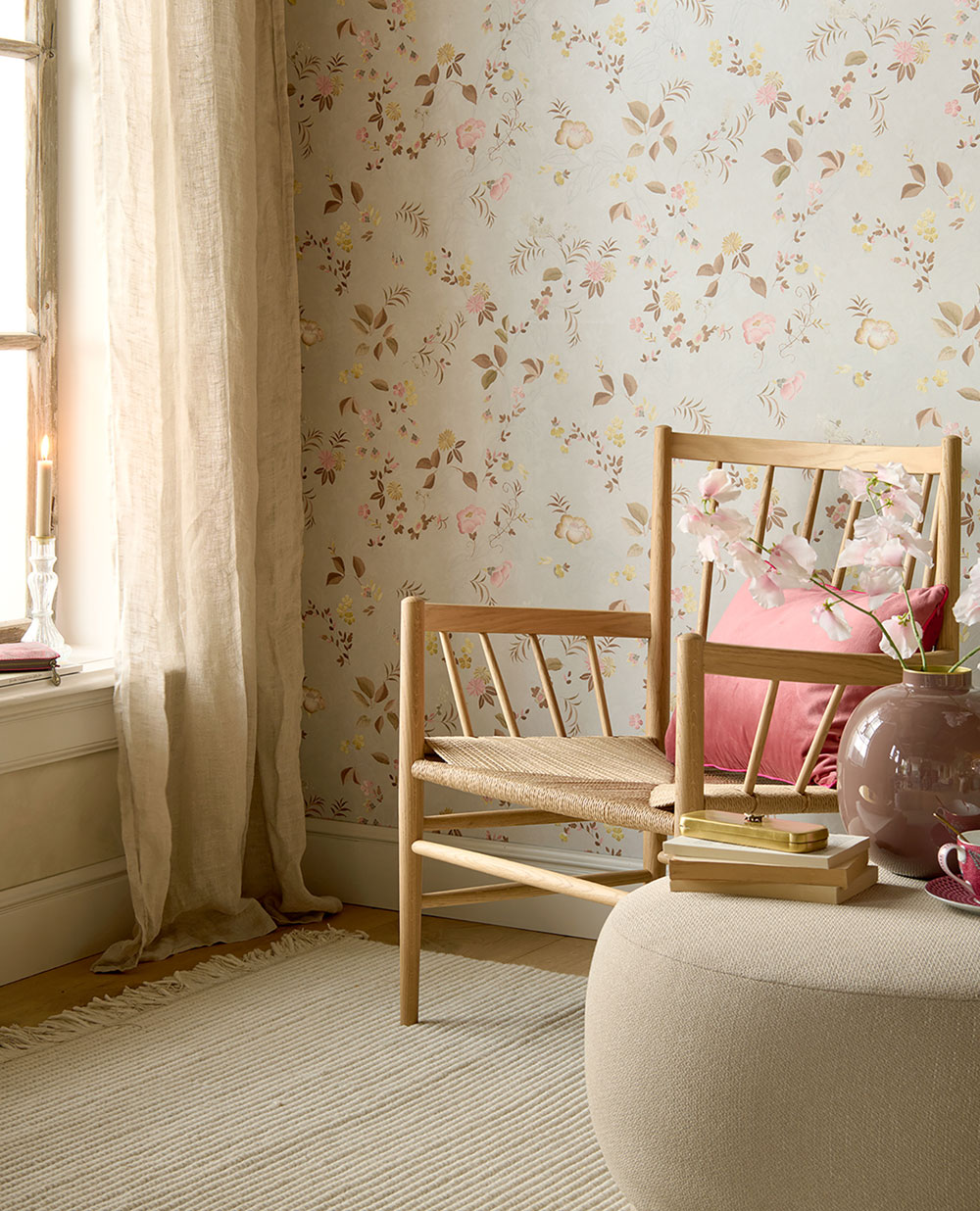 Beigefarbene Vliestapete mit Blumen- und Blättermotiven.