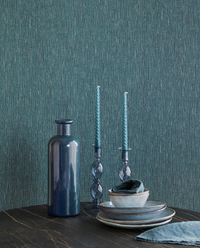 Türkisfarbene Vliestapete, deren Textur an die Struktur eines Stoffes erinnert, dezenter metallisch gestromter Hintergrund.