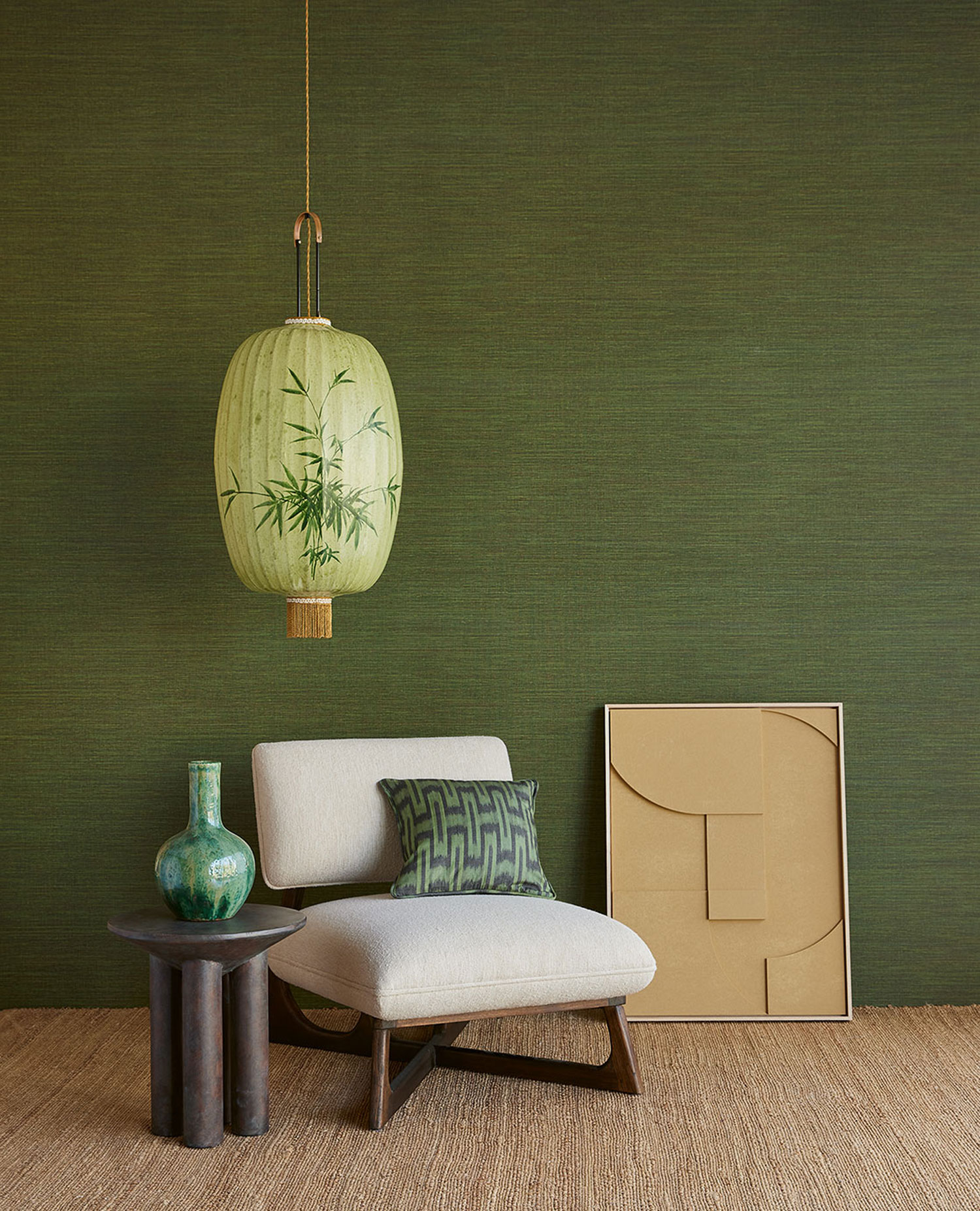 Vliestapete mit Vinyloberfläche, Imitation von gröberem Stoff in Grüntönen.