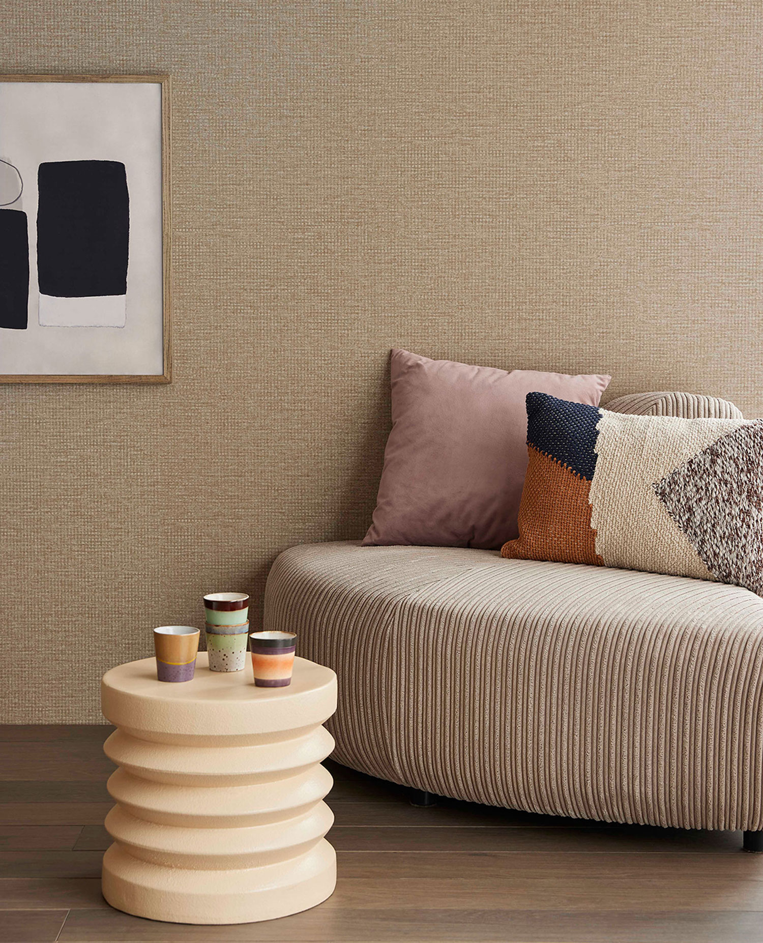 Beige, halbglänzende Vliestapete, geprägtes geometrisches Muster erinnert an Stofftextur - ein Hauch von Rosa. Das Innenfoto dient nur zur Veranschaulichung - verschiedene Farben