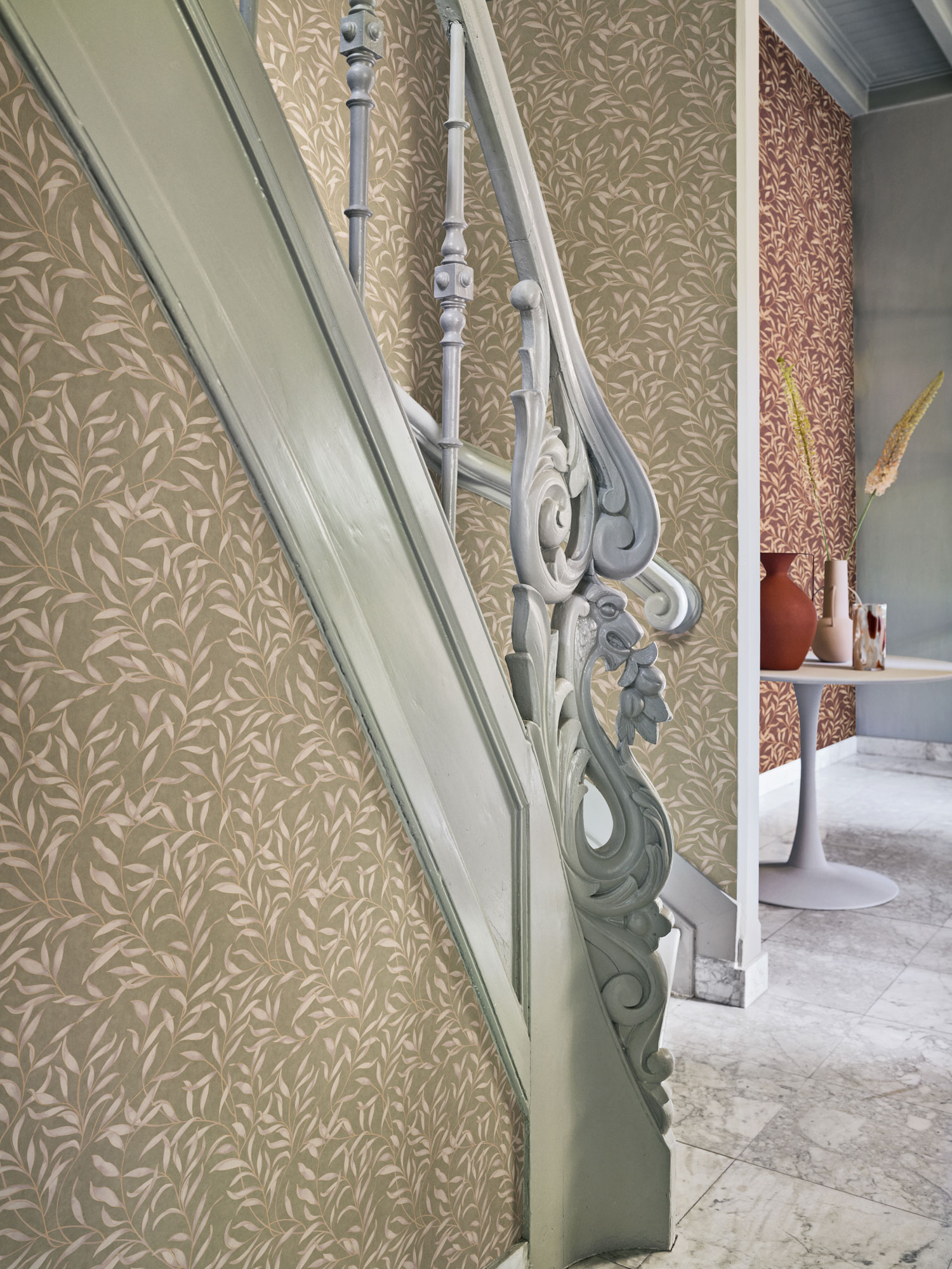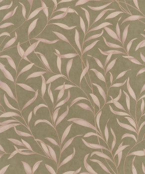 Grüne feinstrukturierte Vliestapete mit Vinyloberfläche, Motive aus Zweigen, Blättern, in Rosatönen.