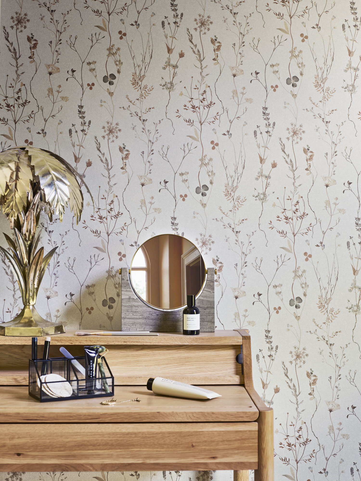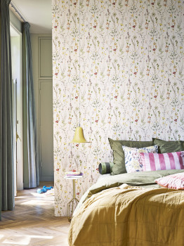 Beige Vliestapete mit Vinyloberfläche, Muster aus zarten Wiesenblumen.