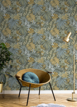 Vliestapete mit Vinyloberfläche, Motiv Dschungel und Blätter, Grün-, Blau-, Ocker- und Grautönen.