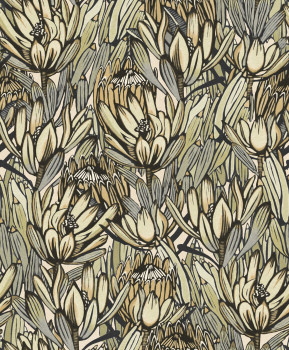 Glatte grau-beige florale Vliestapete, exotische Protea-Blüten und Blätter.