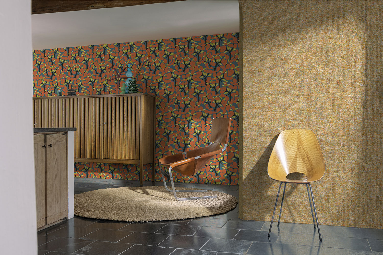 Diese farbenfrohe Tapetenkollektion wird durch Tapeten mit zarten Mustern aus Papyrus- und Stoffimitationen ergänzt.