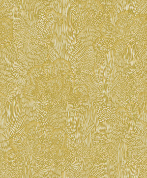 Zart geprägte gelbe Vliestapete, goldene grafische Linien – Motiv aus Landschaft und Bäumen. Das Innenfoto dient nur zur Veranschaulichung - verschiedene Farbe
