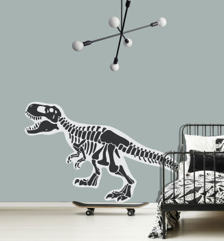 Vorgeklebte Wanddekoration aus Vlies - Dinosaurierskelett. Die Dekoration hat auf der Rückseite einen Kleber, der durch Auftragen von Wasser aktiviert wird.