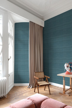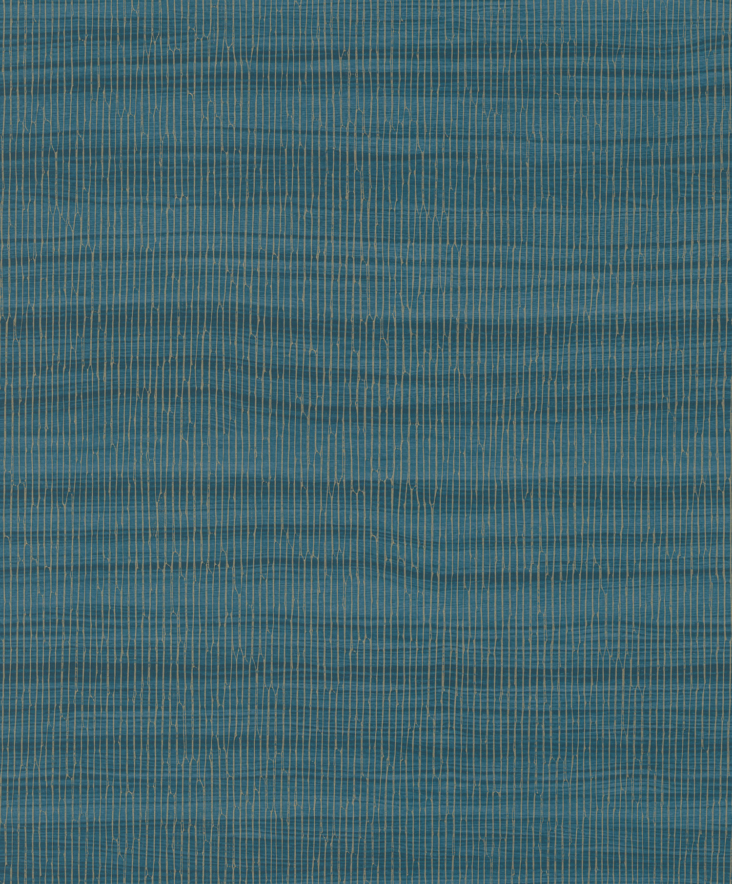 Grob strukturierte Vliestapete mit Vinyl-Oberfläche, blauer Hintergrund, goldene Prägelinien.