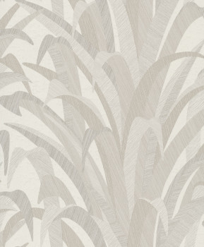Cremefarbene Vliestapete mit grauen und grau-beigen Grasblättern. Die Blätter haben eine spektakuläre Abwechslung der Texturen.