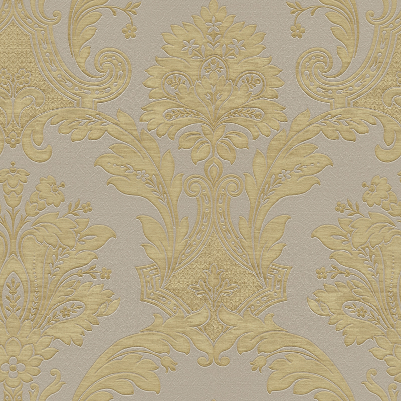 Luxuriöse Vliestapete mit Vinyloberfläche - großes, geprägtes Golddamastmuster auf halbglänzendem, cremefarbenem Stoffhintergrund.