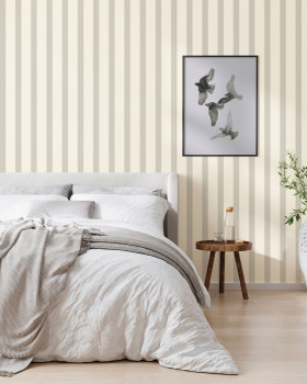 Luxuriöse Vliestapete mit Vinyloberfläche - halbglänzende Beige- und Goldstreifen, dezent geprägte Struktur. Streifen ca. 4,5 und 8,5 cm. Das Foto des Innenraums dient nur zur Veranschaulichung – verschiedene Farben.