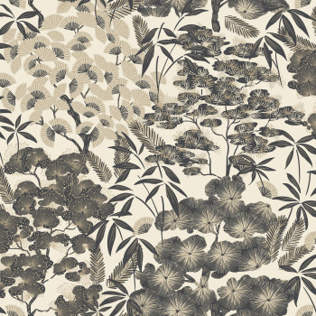 Beigefarbene Vliestapete mit Blumen und Blättern in Schwarz-, Beige- und sanften Metallic-Goldtönen.Das Foto des Innenraums dient nur zur Veranschaulichung.