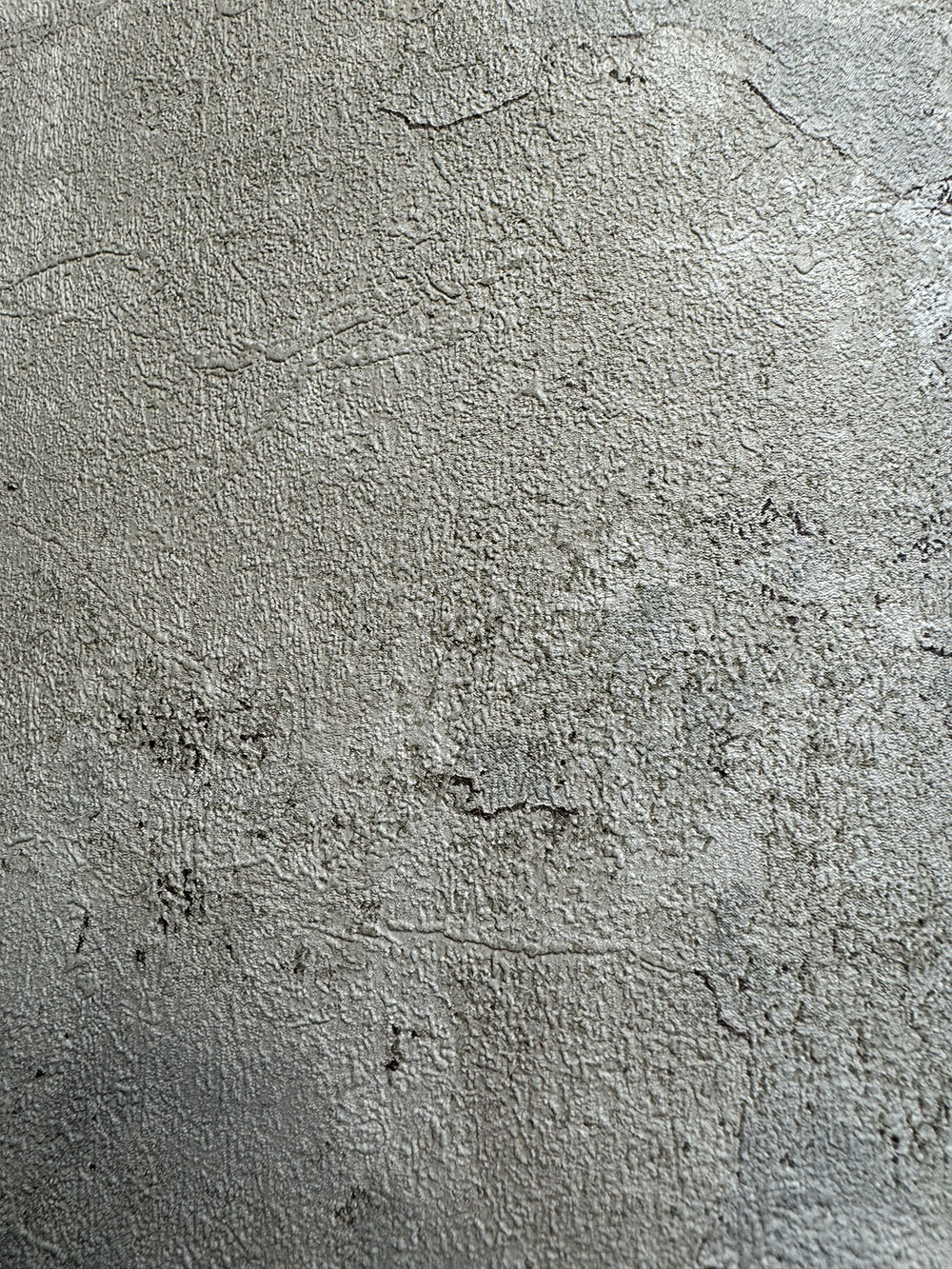Grau-beige Vliestapete mit dem Aussehen einer verwitterten Betonwand und feiner Körnung.