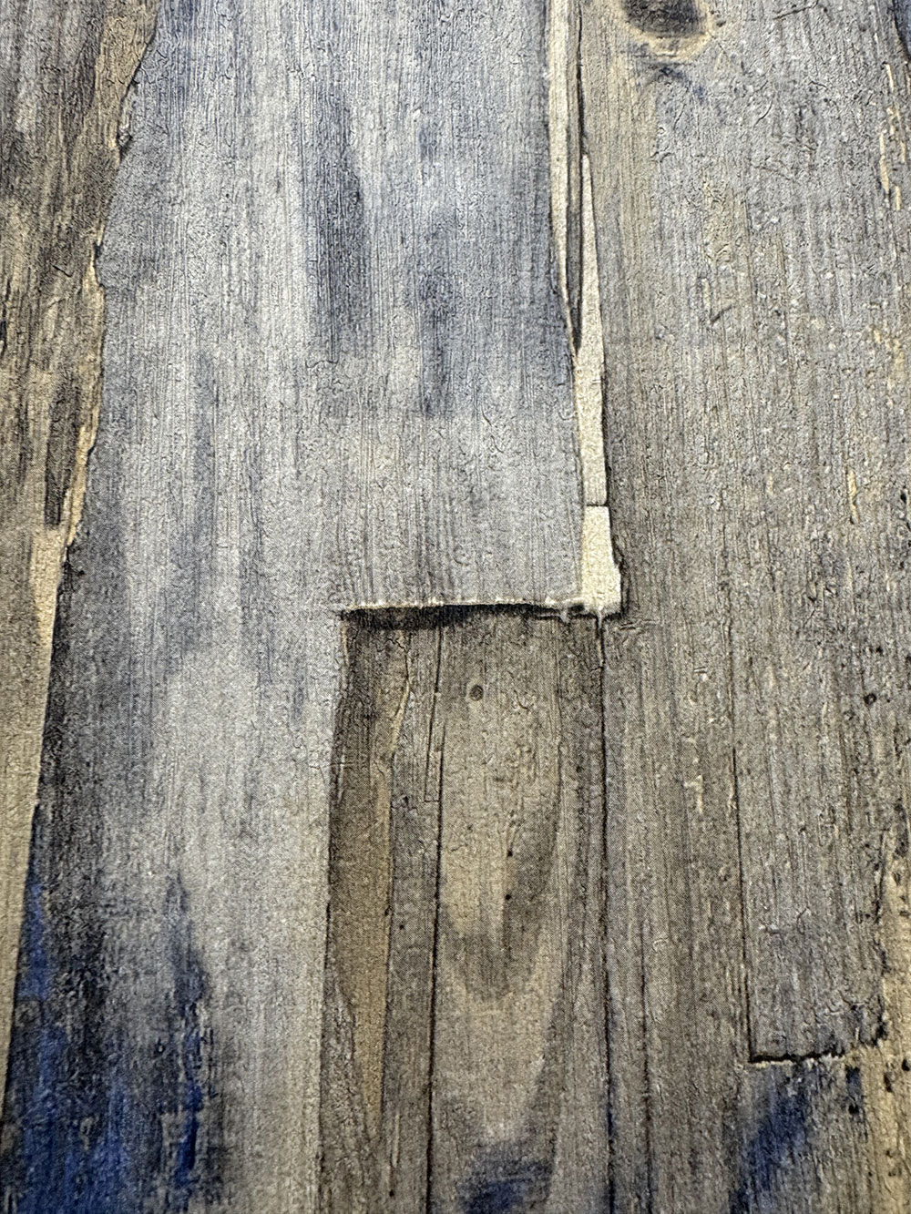 Vliestapete in Holzoptik in Braun-, Grau- und Blautönen.