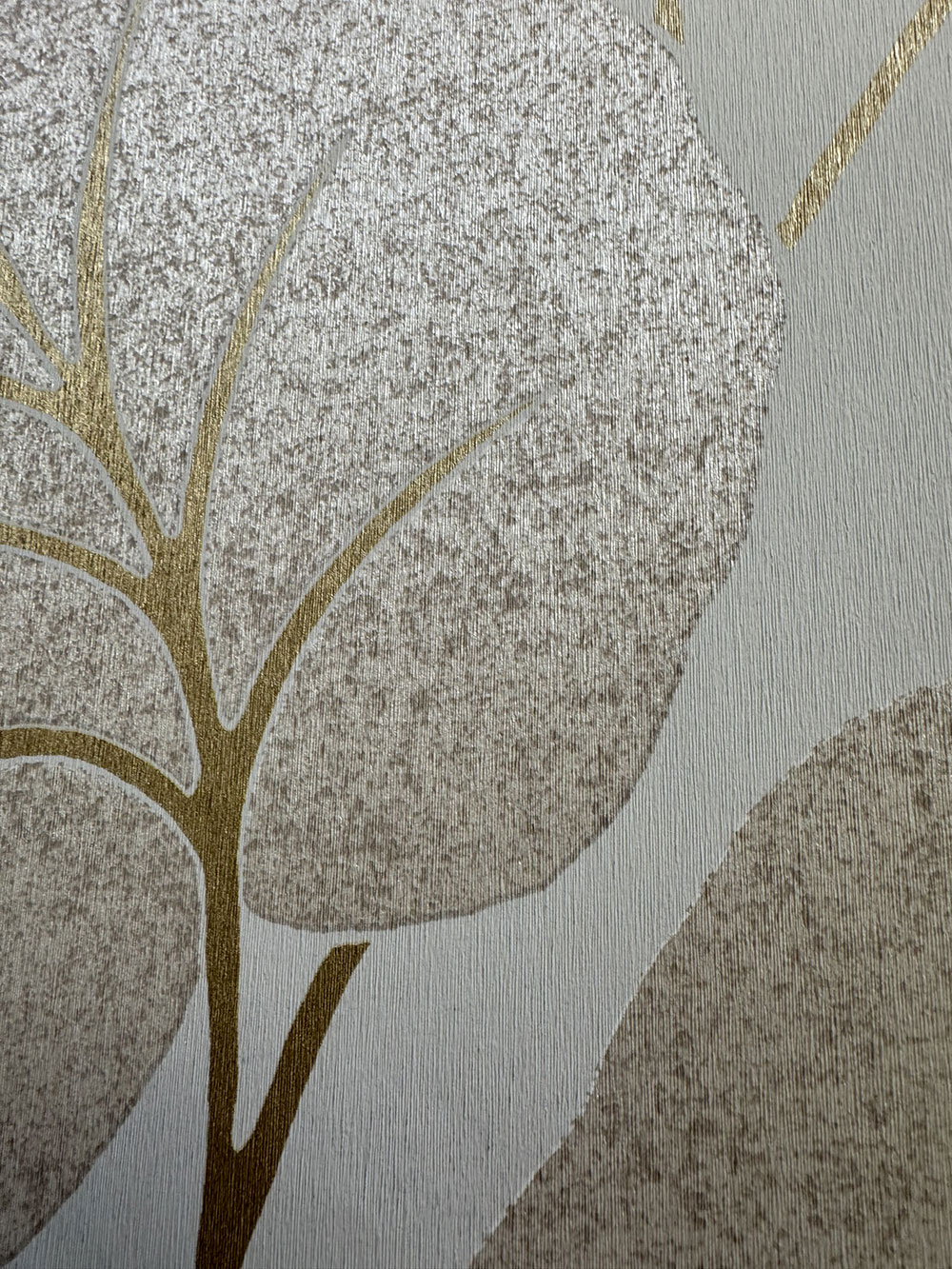 Halbglänzende graue und cremefarbene Vliestapete mit Blättern und goldenen Stängeln. Das Foto des Innenraums dient nur zur Veranschaulichung.