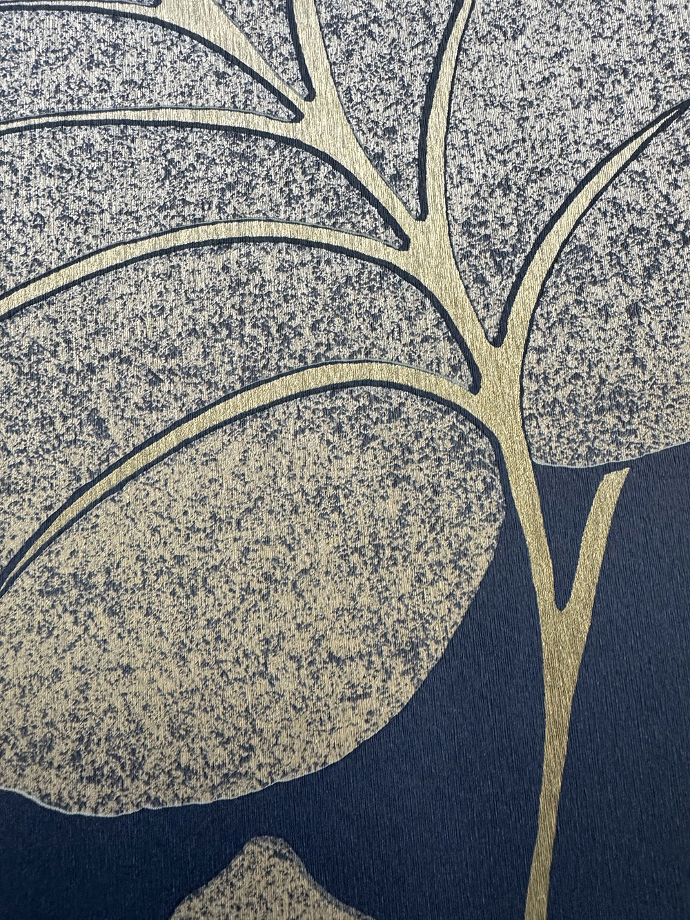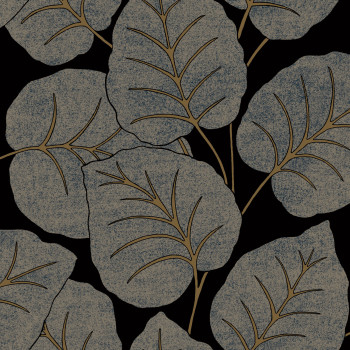 Halbglänzende blaue Vliestapete mit Blättern und goldenen Stängeln.