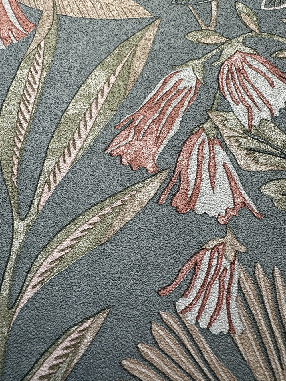 Vliestapete - Blumen und Blätter in Rot-, Braun-, Blau- und Grüntönen auf grünem Hintergrund. Das Foto des Innenraums dient nur zur Veranschaulichung.