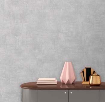 Graue Vliestapete mit Vinyloberfläche und gröberer Stoffstruktur.