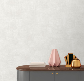 Grau-cremefarbene Vliestapete mit Vinyloberfläche und gröberer Stoffstruktur.