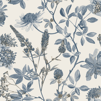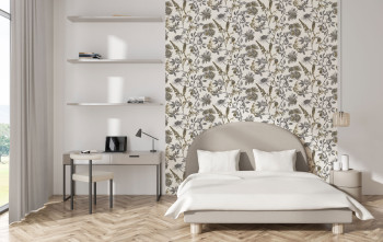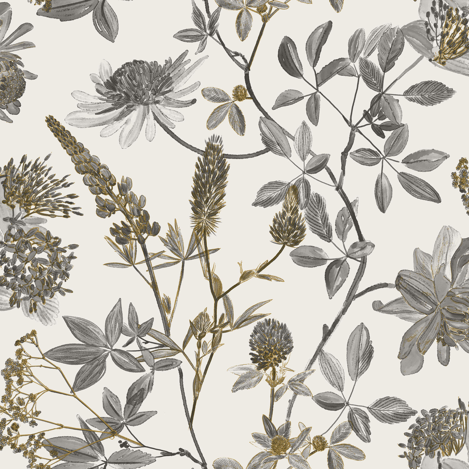 Weiße Vliestapete, Vinylunterlage, grau-schwarzes Muster aus Wiesenblumen mit goldenen Konturen und Details.